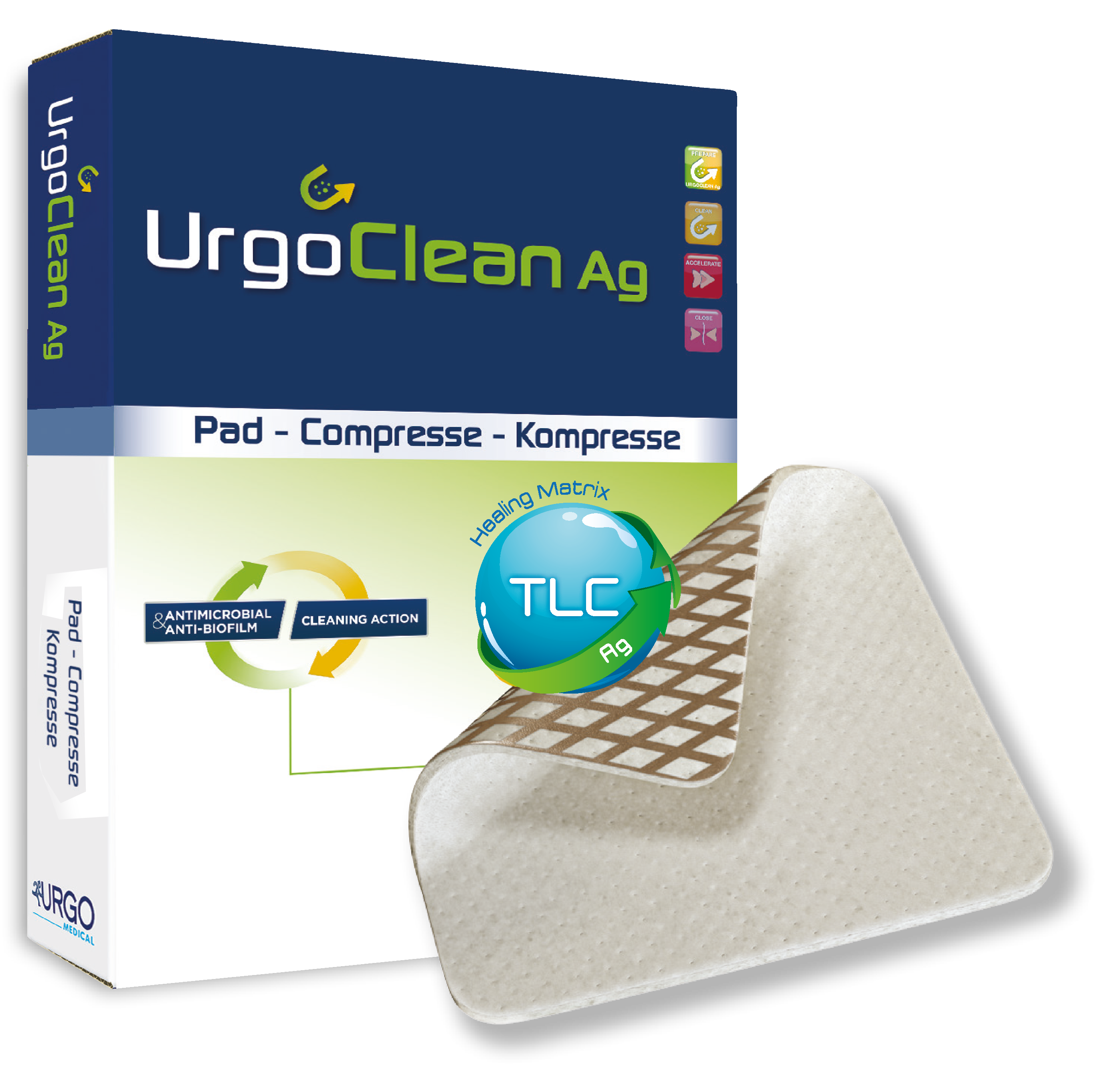 Avise-me quando chegar!UrgoClean Ag a unica cobertura antibiofilme com prata e ação de limpeza completa. É indicada para todas as feridas exsudativas com risco ou sinais de infecção local.